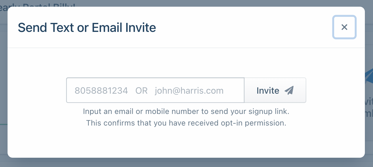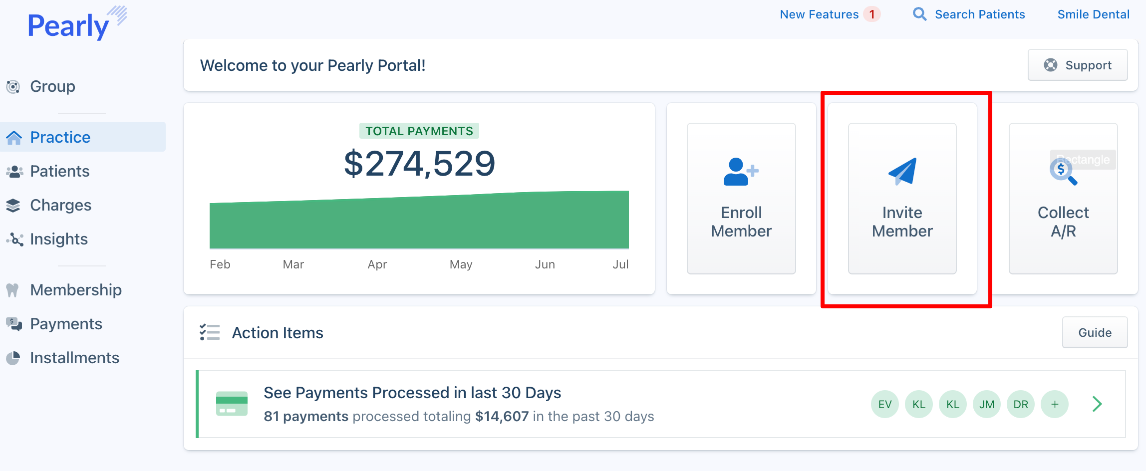 From the Pearly Portal, simply click the Invite Member button on the homepage, then enter the mobile phone or email on the home screen and click Invite. Your patient will receive a notification with a link to your Signup Page so they can review your plan details and self-enroll.