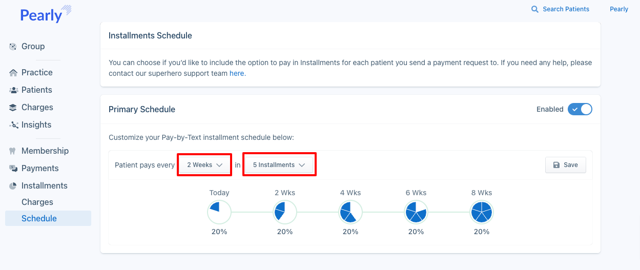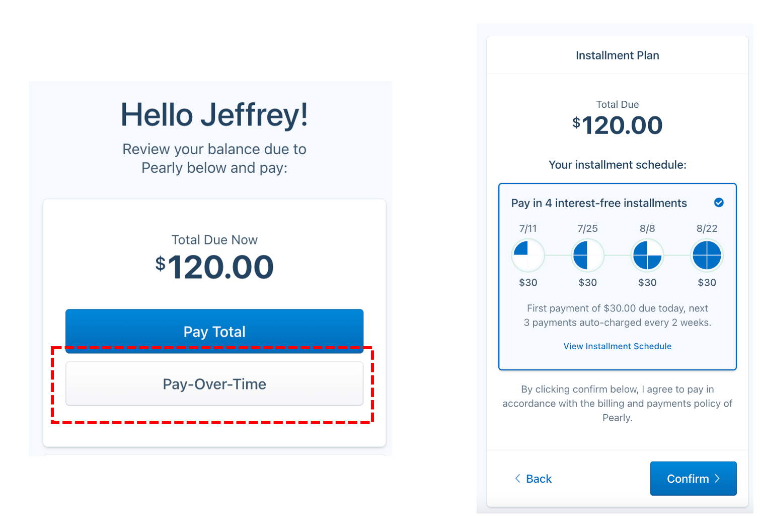 Yes! Pearly allows your practice to enable customized payment plans. You may provide patients with an option to Pay-Over Time when collecting funds with Pearly. You choose the Installment Schedule and we automate billing.