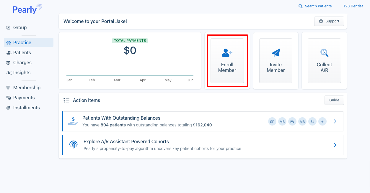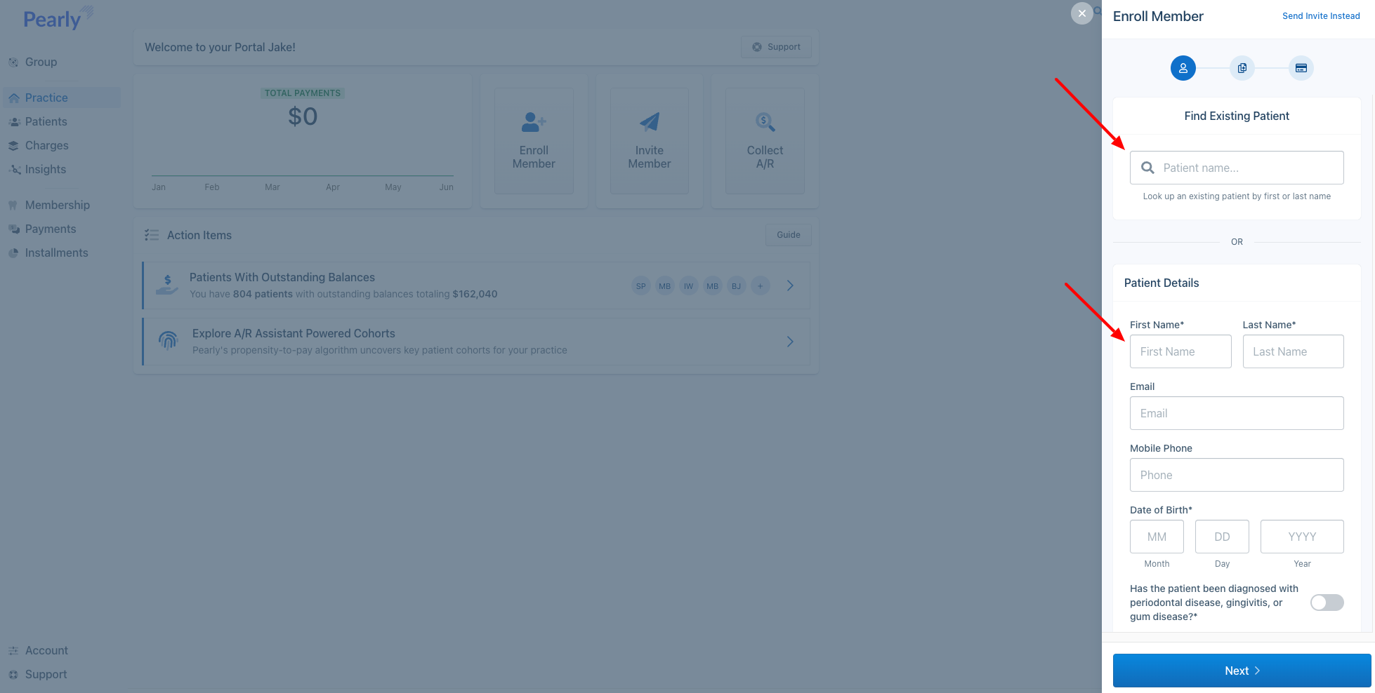 Click the Enroll Member link on the Home screen of your Pearly Portal and follow the prompts. You will enter the patient's information, select the membership plan, and add their credit card details. That's it!