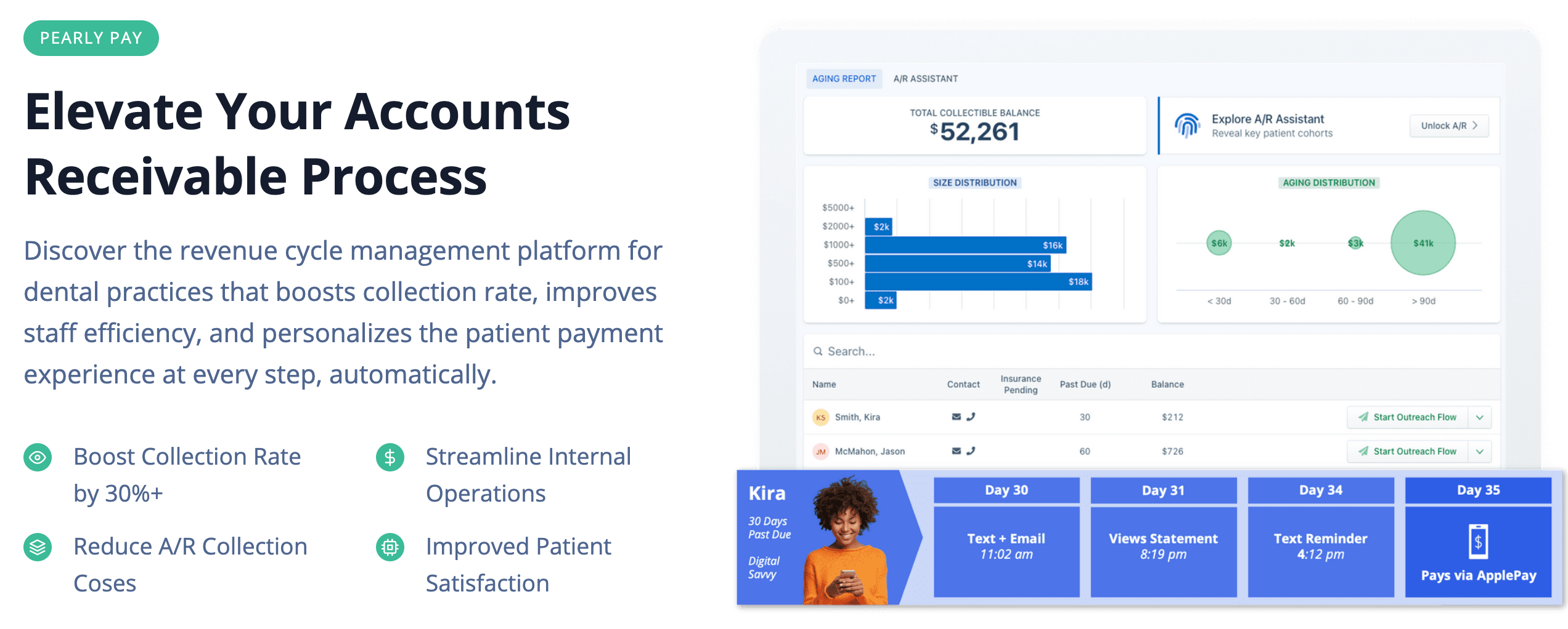 Our A/R Assistant helps your practice uncover key past due patient cohorts and our outreach optimization engine engages patients at the right time, with the right message. The patient can view their balance on any device, review treatment history, and complete payment with their preferred payment method, including self-selecting an in-house installment plan.